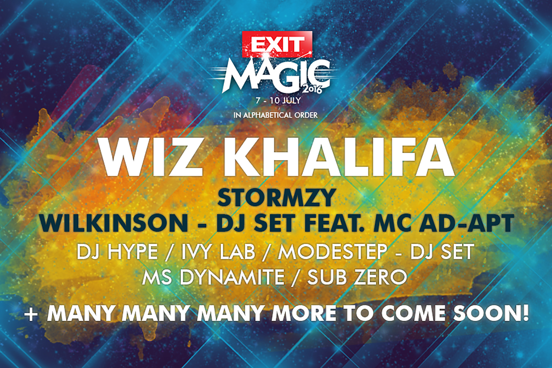 Vožnju kroz magičnu Exit Avantura 2016 do sada su potvrdili i trenutno najveća svetska hip-hop zvezda, Wiz Khalifa, zvanično najbolji evropski reper Stormzy, te impresivna lista X-Bass izvođača: Ms. Dynamite, DJ Hype, Sub Zero, Wilkinson DJ Set feat MC Ad-Apt i Modestep DJ Step.