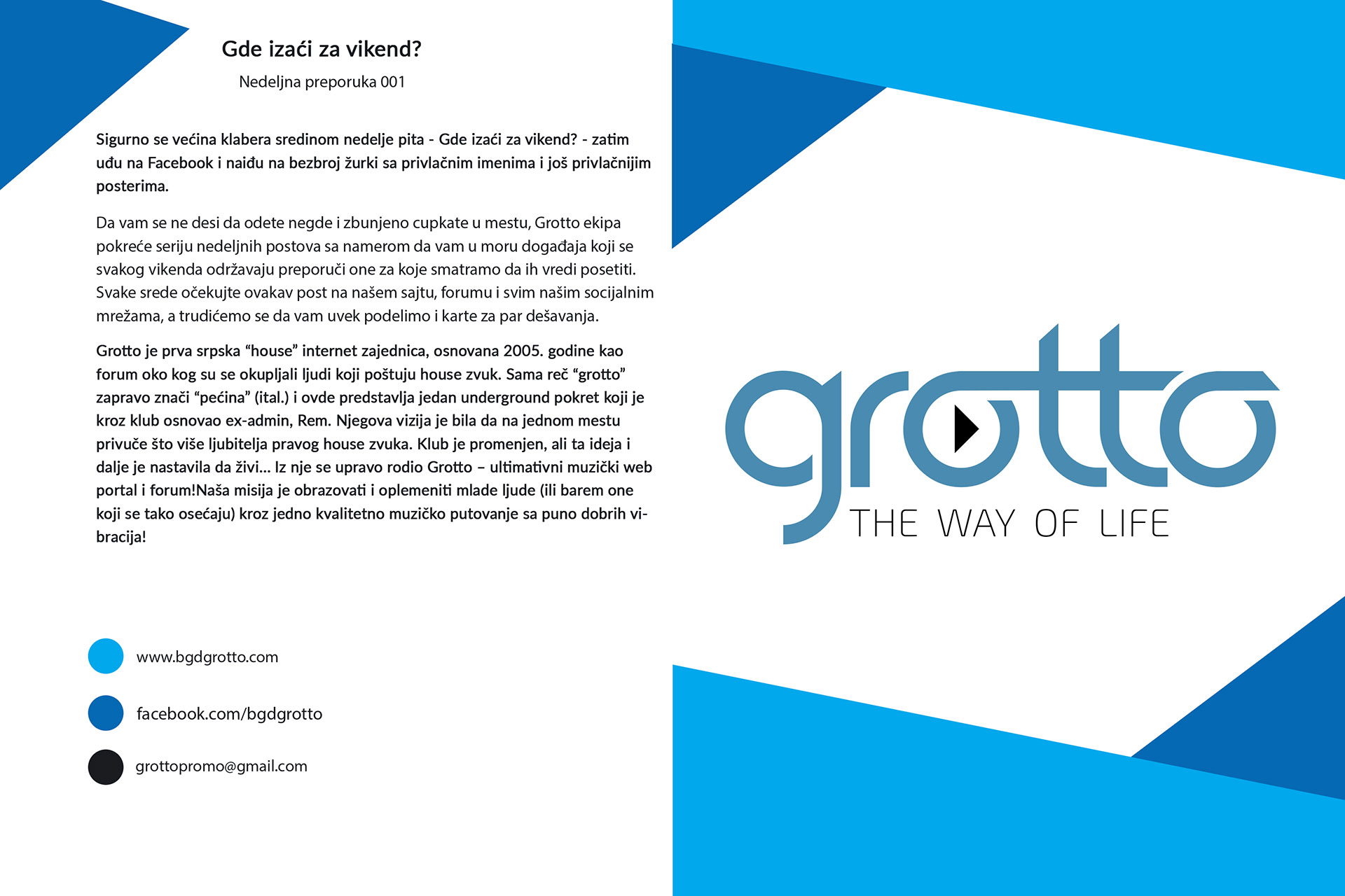 Sigurno se većina klabera sredinom nedelje pita – Gde izaći za vikend? – zatim uđu na Facebook i naiđu na bezbroj žurki sa privlačnim imenima i još privlačnijim posterima. Da vam se ne desi da odete negde i zbunjeno cupkate u mestu, Grotto ekipa pokreće seriju nedeljnih postova sa namerom da vam u moru događaja koji se svakog vikenda održavaju preporuči one za koje smatramo da ih vredi posetiti. Svake srede očekujte ovakav post na našem sajtu, forumu i svim našim socijalnim mrežama, a trudićemo se da vam uvek podelimo i karte za par dešavanja.