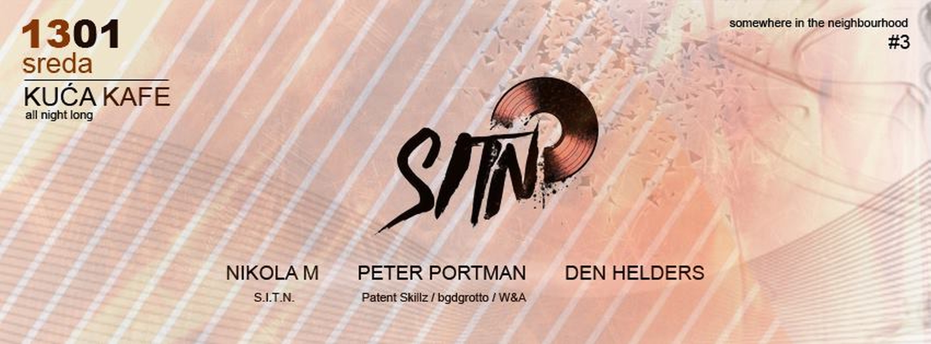 Za doček Pravoslavne nove godine S.I.T.N. ekipa je rešila da, za sve vas koji ste ljubitelji Techno zvuka, napravi pravi spektakl – poseban koncept žurke pod imenom SOMEWHERE IN THE NEIGHBOURHOOD, koji će predstavljati pravi srpski Boiler Room.