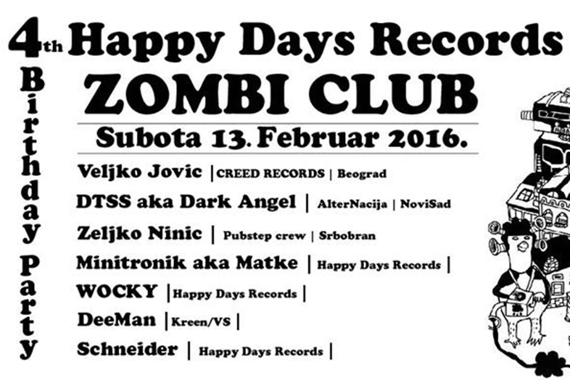 Happy Days Records se bavi organizacijom i promocijom kvalitetnih žurki, a jedna od takvih je proslava četiri godine postojanja istoimenog lejbla. Proslava će se održati 13. februara u kafeu Zombi, u Bečeju. Ovim putem pozivaju sve ljubitelje kvalitetnog zvuka da se odazovu i uveličaju ovu proslavu!