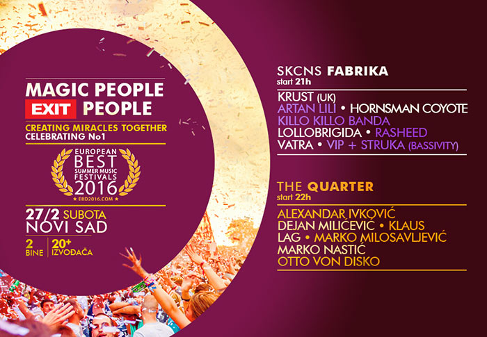 Povodom osvajanja nove titule Najboljeg evropskog festivala za 2016. godinu, Exit organizuje veliku žurku pod nazivom „Magic People – EXIT People„! Proslava novog priznanja održaće se u subotu, 27. februara od 20h u Kineskoj četvrti u Novom Sadu u susednim halama SKCNS Fabrika i Quarter! Za sve fanove koji prethodno registruju svoje ulaznice za ovogodišnji Exit festival ili Exit Avanturu, ulaz je slobodan! Program predvodi britanski DJ Krust, a na dve bine nastupiće neki od najpopularnijih domaćih i regionalnih bendova i disk džokeja, među kojima i Lollobridgida, Artan Lili, Marko Nastić, Dejan Milićević i Marko Milosavljević!