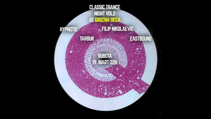 Ukoliko se neko nije još pobudio, ovo je idealna prilika jer vas očekuje žurka pod nazivom Classic Trance Night Vol.2 koja će se odžati 19. marta u klubu Grozna deca (kod Vukovog spomenika) sa početkom u 22h. Imaćete priliku da uživate u zvucima progressive-a,trance-a,tech-trance-a kao i old school trance-a.