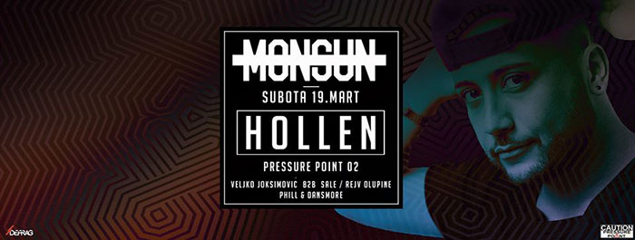 Jedan od najtalentovanijih i najuspešnijih italijanskih techno producenata Hollen nastupiće prvi put pred beogradskom publikom u subotu 19. marta u Monsunu na Pressure Point 02 žurci. Domaća podrška Hollenu biće Veljko Joksimović, Sale (Rejv Olupine) i Phill & Dansmore.