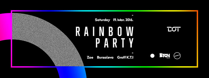 U subotu, 19. marta, Rainbow ekipa u klub Dot donosi prvu žurku i njome otvara vrata prolećnoj sezoni. Za DJ pultom vas željno iščekuju vama dobro poznati Zoe, Bursaćeva i Grof K.T.I.