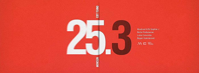 Ponovo se vraćamo u savšen prostor za novo Edit:Tehno putovanje, Beogradski klub Monsun. Talasi niskih frekvencija i majstorsko slaganje muzike i ovoga puta biće zaslužno za otkačeni vajb, a uz to, spremili smo i dva gosta za potpunu Tehno projekciju.