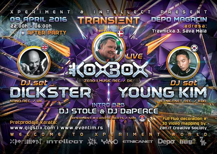 Ako iko poznaje tajne i dubine psychedelic trance fenomena, to onda moraju biti njeni pioniri. Frank E, Young Kim i Dickster dolaze iz potpuno različitih delova sveta, ali sa istim ciljem; da svoje kulturološke razlike prikažu kroz svoj autentičan zvuk i da ih kroz publiku povežu u jednu divnu celinu. Transient je podvig koji je usmeren na ljude, osmeh, energiju, zvuk i ples. Oni koji to razumeju, dobrodošli su ove subote, 9. aprila u Magacin Depo.