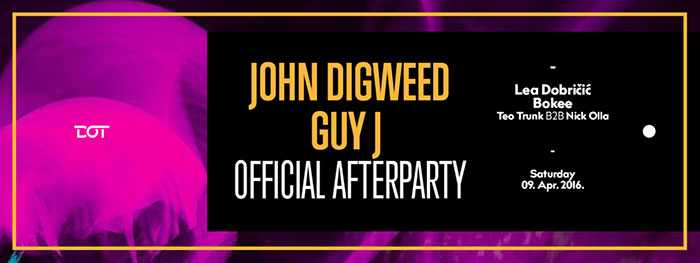 Najveći rejv ovog proleća dešava se u petak, 8. aprila u Belexpocentru uz nastup John Digweed-a i Guy J-a, ali tu žurki nije kraj! Zvanični afterparti zakazan je za 5 ujutru u klubu Dot na adresi Francuska 6, a za neumorne klabere muziku će vrteti ekipa u sastavu Lea Dobričić, Bokee i Teo Trunk b2b Nick Olla.