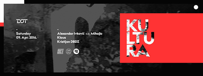 Klub Dot radi i večeras, a na programu je Dotted Thursday uz all night long DJ set Milovana Stojanovića iz DBDZ ekipe. U subotu, 9. aprila, veče pod nazivom Kultura podsetiće nas na sve ono što je čovek stvorio svojim radom, a u svrhu održanja, poboljšanja i napretka ljudske vrste. Za muzički izbor biće zaduženi Mihajlo b2b Alexandar Ivković, Klaus i Kristijan iz DBDZ kolektiva. Party počinje u 23h, a cena ulaznice je 300 dinara.