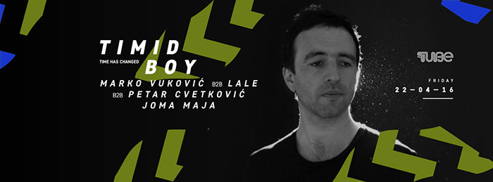 U petak 22.04. nam dolazi Damien Almira, poznatiji kao Timid Boy. Momak koji je u centru pažnje svetske elektronske muzičke scene još od 2003. godine kada je počeo da pušta u pariskom klubu Rex, tokom godina je radio pored imena kao što su Paul Kalkbrenner, Jeff Mills, Luciano, Seth Troxler i drugi. Poznat je i po tome što sa Acumenom vodi čuveni „Time Has Changed“ label koji mnogi ubrajaju u jedan od najjačih francuskih lejblova, a za koji su do sada izdavali Oxia, Barem, Metodi Hristov, Carlo Lio, Rhadow, Alexkid, Matthias Meyer i druga vrhunska imena svetske scene, dok je on sam izdavao za Sci + Tec, Saved, Viva, Form, Detone, Barraca i druge. Publika će ove večeri u Tjubu imati priliku da čuje i specijalan triple back2back intro koji će obezbediti Lale, Petar Cvetković i Marko Vuković; dok će outro raditi Joma Maja, jedna od finalistkinja čuvenog burn DJ takmičenja u BiH. Ova sjajna devojka koja se istakla svojim nastupima na Exit-u kao i na drugim festivalima u regionu potrudiće se da iz kluba izađete tek sa prvim zracima sunca. Cena karte je 300 rsd i možete je kupiti na ulazu u klub na veče žurke.