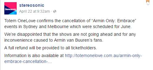 Trance legenda Armin van Buuren je bio primoran da odustane od svoje predstojeće turneje pod nazivom Embrace po Australiji koja je trebala da se održi u junu ove godine. Potvrdu o otkazivanju izneli su u petak sami organizatori, Totem OneLove, na Stereosonic Facebook stranici, dodajući da će vlasnicima karata biti vraćen pun iznos karte.