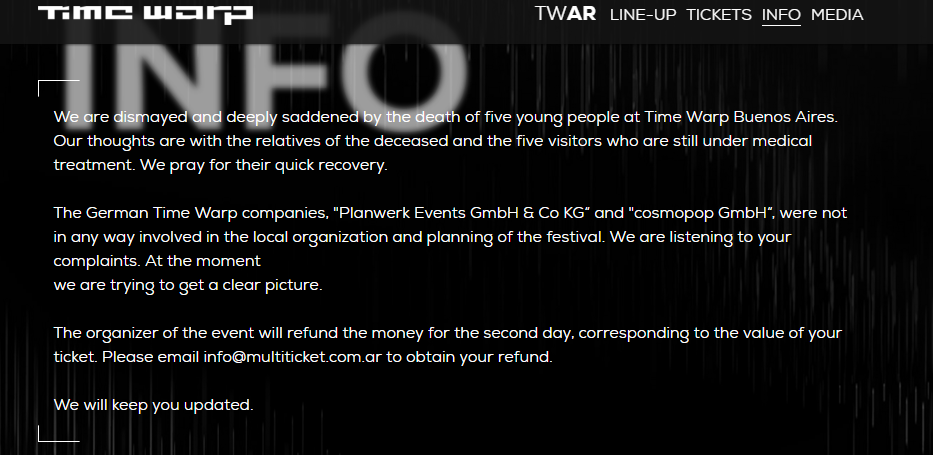 Nakod nedavne tragedije koja se desila u Argentini na festivalu pod nazivom Time Warp, doneta je odluka od strane argentinske vlade da se prestane sa izdavanjem dozvola kojima se omogućuje održavanje velikih festivala elektronske muzike. Sve ovo je reakcija povodom tragične smrti čak 5 ljudi koji su preminuli usled predoziranja. Pored ovih žrtava, još njih devetoro se nalazi u kritičnom stanju, a sumnja se da su pretrpeli trovanje nekim opijatima na pomenutom festivalu.