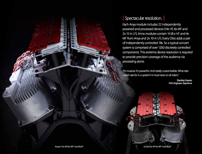 Projektanti iz kompanija EAW, otišli su korak, tačnije celu generaciju dalje i potpuno se suprostavili zakonima fizike kada je prostiranje zvuka u pitanju. To je prvi „adaptivan“ zvučni sistem koji samostalno „skenira“ prostor i raspoređuje snagu i frekventni spektar u prostoru unutar sistema bez neželjenih kompromisa prilikom usmeravanja zvučnih kutija. Sistem čiji oblik je potpuno revolucionaran uvek stoji potpuno uspravno dok niz kompjutera analizira prostor i prilagođava mu tako da svi u publici čuju jednako moćan i precizan zvuk u svakom trenutku! Više tonski inženjeri ne moraju da računaju uglove, a tehničari da menjaju pozicije u slučaju da se menja konfiguracija prostora, publike ili ako se otvara nova tribina! Unutar svake pojedinačne kutije u sistemu postoji po neverovatnih 22 zvučnika i 22 pojačala, koji u zbiru Anyi daju ukupnu snagu od 10.000W! Putem specijalnog „Resolution“ softvera i internih, kako fizičkih, tako i faznih kontrolisanja, sistem u svakom trenutku može da rasporedi zvuk na svaku željenu tačku prostora, bez kompromisa u određenim zonama ili sektorima. Zaista je nesvakidašnje da jedna kompanija iz Srbije prva u Evropi predstavi ovako inovativnu tehnologiju najvišeg tržišnog ranga. Cena koncertne konfiguracije EAW-Anya koju će Skymusic produkcija instalirati na glavnoj bini Exita dostiže čak 1,5 miliona dolara, a publika na Petrovaradinskoj tvrđavi uživaće tako u zvuku koji će ostatak Evrope imati priliku da čuje tek u narednim godinama.