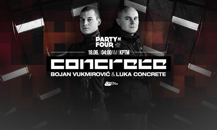 Legendarni beogradski techno duo Luka i Bojan prirediće još jednu opasnu jutarnju vožnju i hipnotisati publiku opako dobrim betonskim setom. Posetioci će imati priliku i da uvežbaju kondiciju, jer se na njihovim žurkama nikada ne stoji, a oni koji su zaboravili kako izgleda Concrete partijanje podsetiće se zbog čega techno ipak nema alternativu.