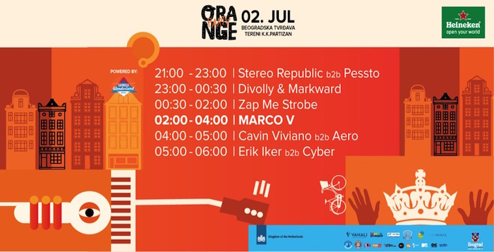 Po ugledu na amsterdamski Kingsday, svi u narandžastom će đuskati, a holandski di-džej Marco V svojim energičnim bitovima će napraviti sjajnu atmosferu. Domaću podršku pružiće mu Zap Me Strobe, Cavin Viviano, Erik Iker, Divolly & Markward, Aero, Pessto, Stereo Republic i Cyber.