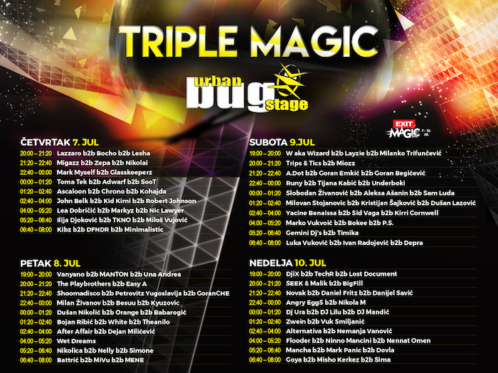 I ove godine na Urban Bug Stageu na Exitu publiku očekuju triple back setovi tokom sva četiri festivalska dana. Budući da godinama unazad važi za jednu od najboljih malih festivalskih bina na Exitu, Urban Bug Stage je prošle godine otišao korak dalje triple back setovima u okviru kojih je nastupilo više od 100 di-džejeva. S obzirom na fantastičnu atmosferu koja je vladala, sa Urban Bug Stagea će se i ove godine širiti dobar vajb na isti način.
