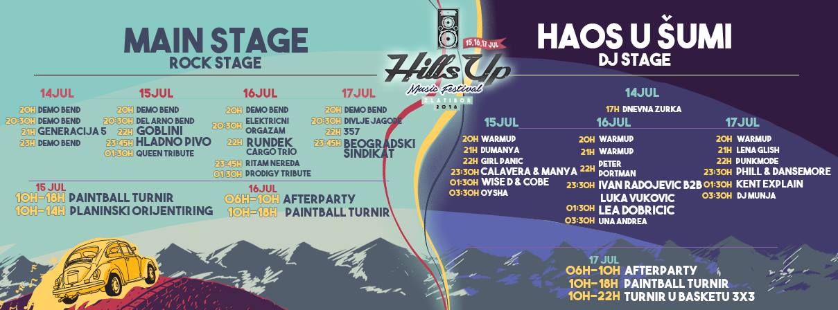 1. Hills Up Festival (Haos u Šumi) // Lokacija – Zlatibor // 15-18. jul – Sjajna ekipa mladih ljudi sa Zlatibora se ozbiljno organizovala ove godine i uz vrlo jak domaći lineup odlučila da na dva stage-a napravi pravi Haos u Šumi. Pored klupskog lineupa koji čine Lea Dobričić, Calavera & Manya, Phill & Dansmore, Wise D & Kobe i mnogi drugi – tu su i alternativni rok/hip-hop izvođači kao što je Beogradski Sindikat, Hladno Pivo, Generacija 5, Darko Rundek i ostali. Uz sve to postojaće i dnevne žurke i afteri tako da će partijanje trajati 72 sati okruglo. A ko želi da uživa u prirodi tu su i akcije kao što Planinski Orijentiring, Turnir u Basketu 3×2 i Paintball Turnir. Karta za sva tri dana je 2000 RSD, dok je jednodnevna 700 RSD.
