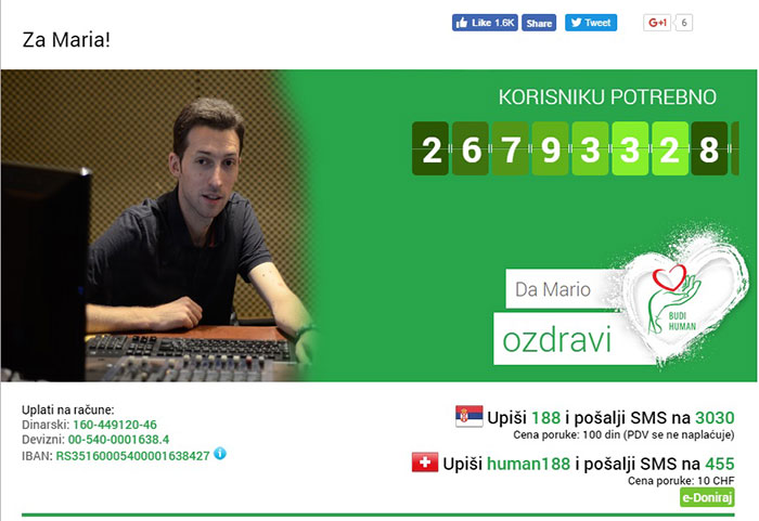 Za Marija je već prikupljeno 135.000 evra i nedostaje još 55.000 evra kako bi počeo sa TIL terapijom koja je dostupna samo u Tel Avivu (Izrael). Ko želi da donira ili pošalje SMS za Marija – dovoljno je da ukuca 188 na 3030 ili da poseti njegov profil na BudiHuman.rs