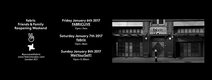 Line Up za vikend otvaranja se čuva u strogoj tajnosti sa radnim nazivom „Friends & Family Reopening Weekend“, a na plakatu za 6. januar, koji je objavljen, stoji „Fabriclive„. Za subotu 7. takođe ništa ne piše, ali se šuška da će to veče nastupiti rezidenti kluba Terry Francis i Craig Richards. A poslednji dan ovog vikenda, nedelja, rezervisan je za WetYourSelf! žurku.