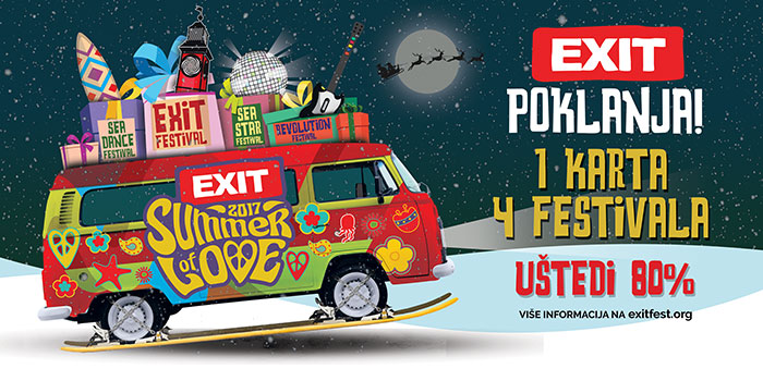 Ovim povodom, EXIT je danas pokrenuo i najveću novogodišnju akciju otkako postoji! Samo tokom predstojećih praznika, u akciji „1 karta = 4 festivala“, svi već postojeći ili budući kupci ulaznice za EXIT festival po ceni od 6.490 dinara, dobiće na poklon i ulaznice za preostala tri festivala EXIT Leta ljubavi 2017, za Sea Star festival u Hrvatskoj (26. i 27. maja), Revolution Festival u Rumuniji (2. i 3. juna), te Sea Dance festival u Crnoj Gori (13-15. jula). Broj ulaznica u ovoj akciji je veoma ograničen, a svi kupci, postojeći ili budući, svoje EXIT ulaznice moći će lako da registruju od 1. do 28. februara na sajtu www.exitfest.org.