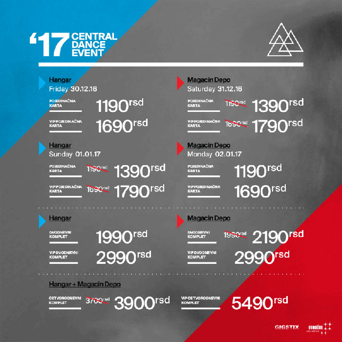 Kako se bližimo dočeku 2017. promo karte za Central Dance Event se munjevito prodaju, a cene regulrnih i VIP karata su sve veće i veće.