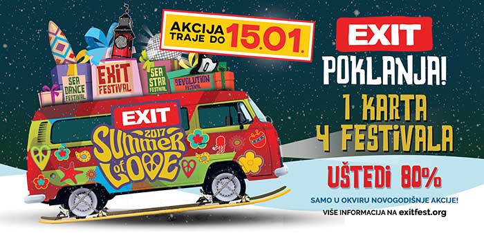 Ledeni talas u regionu do 15. januara otopiće EXIT Leto ljubavi, jer do tada traje i najveća praznična akcija otkako postoji EXIT. Samo do tada, svi kupci ulaznica za EXIT, dobiće na poklon i ulaznice za preostala tri festivala EXIT Leta ljubavi 2017, Sea Dance na predivnoj plaži Jaz u Crnoj Gori, proglašenoj od strane Lonely Planet za najbolju plažu Evrope, Sea Star u atraktivnom turističkom kompleksu Stella Marris u Umagu i Revolution festival u istorijskom selu na obodu Temišvara u Rumuniji. EXIT ulaznice po ceni od 6.490 dinara se mogu kupiti onlajn putem sajta exitfest.org, kao i direktno u mreži Gigs Tix na preko 80 prodajnih mesta u 25 gradova širom Srbije. U prodaji je i veoma ograničen broj turističkih paketa za EXIT festival već od 69 evra. Paketi sadrže ulaznice i smeštaj u festivalskom kampu na Dunavu, a na sajtu Exit Tripa, zvanične turističke agencije EXIT Leta ljubavi, moguće je odabrati i drugi smeštaj, u hotelima, hostelima ili apartmanima. U ponudi je i veoma ograničen broj paketa za Sea Star i Sea Dance festivale, po ceni već od 49 evra u koje ulaze noćenja u kampu festivala, kao i ulaznica, a u ponudi je i smeštaj u apartmanima u okviru Sea Star festivalskog kompleksa već od 9.99 evra za noć po osobi. Više informacija na www.exittrip.org.