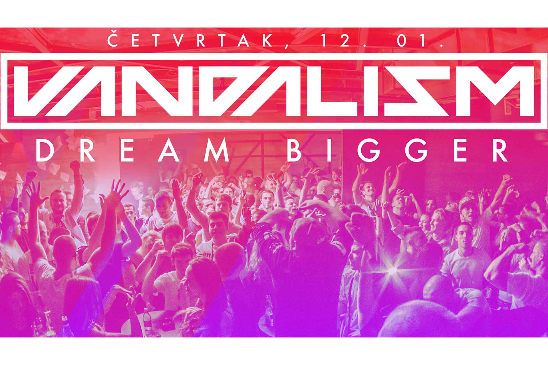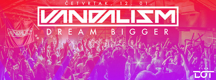 Prvi Vandalism u 2017. godini održaće se u četvrtak 12. januara na već svima dobro poznatoj lokaciji, u klubu Dot (Francuska 6). Ekipa Vandalism-a je odlučila da novu godinu započe na taj način što će po prvi put ugostiti najtraženiji Trap duo na ovim prostorima, Wreckage, u čijem su sastavu dva beogradska DJ-a i producenta, Architect i TML. Iako će oni biti iznenađenje većeri, Vandalism neće zapostaviti pravac koji forsira od samog početka, zato će rezidenti Vandal Steve i Cavin Viviano u svom vrlo prepoznatljivom stilu razdrmati publiku najvećim Progressive House hitovima, dok će mladi Milhouse biti podrška i otvoriti to veče. Naravno, i ovoga puta smo vam spremili mnoštvo iznenađenja poput Co2 topova, konfeta, a svratiće i Deda Mraz.