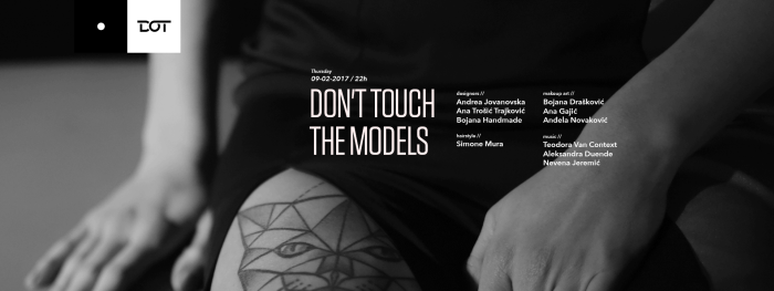 U klubu DOT u cetvrtak 09. februara nešto drugaciji koncept žurke pod nazivom “Don’t touch the models”. To je nova vrsta dogadaja koja prestavlja modnu umetnost u klubskoj atmosferi. Do ranih jutarnjih casova zabavljace vas tri dame, Teodora Babovic, Aleksandra Duende i Nevena Jeremic, koje ce pored svoje klasicne DJ uloge, ove veceri uživati i u ulozi modela, dok puštaju muziku naravno. Pored njih bice još trendsetera koji ce u klubu djuskati u kreacijama i frizurama veoma talentovanih modnih dizajnerki Andree Jovanovske i Ane Trošic Trjakovic, hair artista Simone Mura (Rossano Ferretti Hairspa) i mnogi drugih. Sve se dešava na licu mesta pocetkom veceri dok cemo kasnije svi duskati do jutra uz pregršt ukusnih koktela po promotivnim cenama.