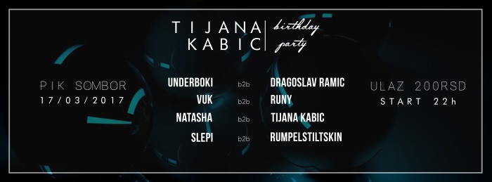 U petak, 17.marta, povod za slavlje je rođendan poznate somborske DJ dame, Tijane Kabić, koju je Mixmag nedavnim osmomartovskim člankom uvrstio među top regionalne dj-ice! Za mix pultom će se tom prilikom naći proverena ekipa iz kraja i komšiluka: