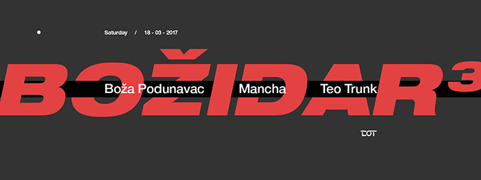 Mi smo iskorisitli moć broja tri kako bismo utrostručili broj Božidara! U klubu Dot u subotu 18. marta Božidar Boža Podunavac, Božidar Mančić Mancha i Božidar Surla aka Teo Trunk će magijom svojih setova pojačanom moćima broja 3 zagrejati atmosferu do ključanja! Tri Božidara će kako to njima svakako dolikuje prirediti nezaboravan provod u Francuskoj 6 i zato ne propustite ovu nesumljivo božansku žurku!