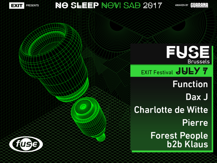 Nezaustavljivi britanski DJ i producent Dax J definitivno dolazi druge noći Exita u okviru Fuse noći, i to u terminu u kojem je nesumnjivo najbolji – „closing set“! Nimalo lak zadatak da opravdaju besprekoran ugled briselskog kluba imaće dva njegova najistaknutija rezidenta, trenutno najhvaljenija belgijska DJ zvezda Charlotte de Witte i prava legenda evropske klupske scene Pierre. Boje #NSNS bine braniće u tandemu bosanskohercegovački producent zavidne međunarodne karijere Forest People i vođa novosadske Public P ekipe Klaus.