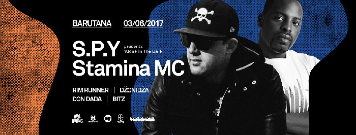S.P.Y je jedan neverovatan umetnik. Potpuno posvećen svom umeću i veštini predstavlja jednu od vodećih etiketa dnb muzike – Hospital Records. Setovam stvara ludačku atmosferu na žurkama i ekploziju sjajne energije! U Beograd stiže 03. juna u okviru turneje povodom novog albuma “Alone In The Dark” koji izlazi u junu. Sa njim će stejdž deliti miljenik domaće publike i stalni gost MC Stamina! Domaću podršku pružiće kao i uvek sjajni Rim Runner, Džonižda, Don Dada i Bitz na prvoj open air Roll The Drums žurci prvi put u Barutani!