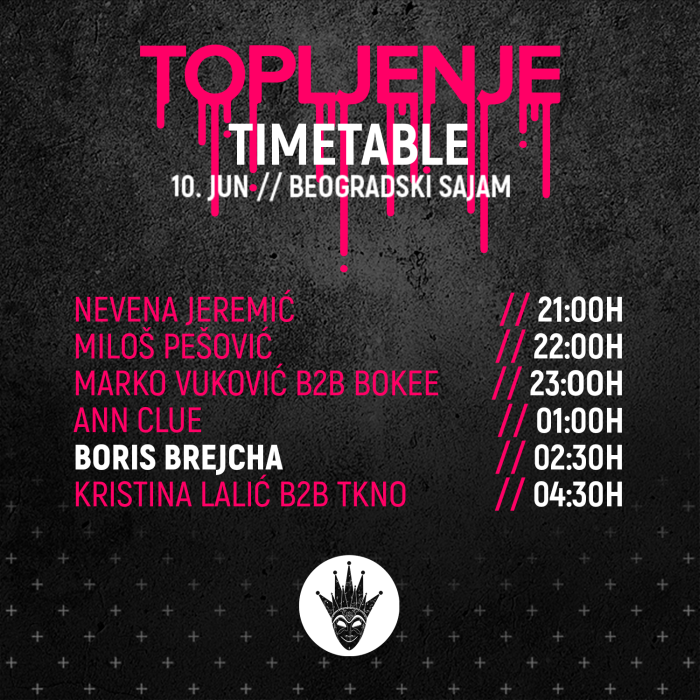 Spektakularno veče otvoriće pobednici DJ konkursa već od 21h – Nevena Jeremić i Miloš Pešović, a za pultom će se naći takođe i domaća techno diva Kristina Lalić u specijalnom b2b setu sa TKNO-m, kao i sastav SillyHeadz koji čine dobro poznati Marko Vuković i Bokee!