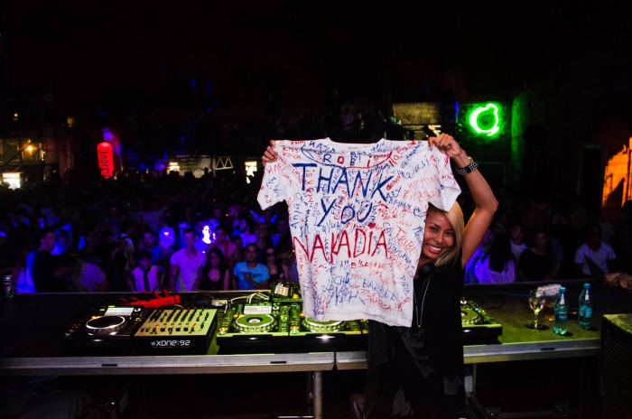 Na početku žurke prišao nam je jedan dečko sa majicom na kojoj piše „Thank You Nakadia – Begrade People“ i pitao nas da se potpišemo, jer su se svi već potpisali. To će da baci Nakadiji kad bude puštala, da ima nekakvu uspomenu na Beograd i ovaj događaj. I tako i bi. Nakadia se obradovala, okačila majicu oko vrata i vratila se puštanju. Kao i prethodnice, Nakadia takođe završava set „pesmom sa rečima“ i to ni manje ni više nego „Underworld – Cowgirl“.