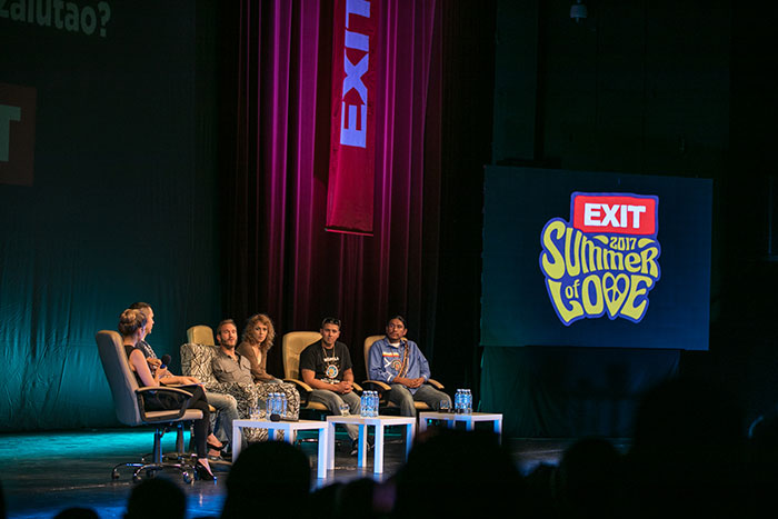 Dok su prvi posetioci stizali na Petrovaradinsku tvrđavu u Srpskom narodnom pozorištu je održana panel diskusija “50 godina od Leta ljubavi – da li je svet zalutao?”, na kojoj su eksluzivno govorili jedan od najboljih motivacionih govornika na svetu Nik Vujičić, članovi Standing Rock pokreta i plemena Sijuks reper Aaron Shawn Turgeon poznatiji pod svojim hip hop imenom Prolific The Rapper i Isaac Weston, kao i osnivač i direktor Exita Dušan Kovačević. Učesnici su se složili da promena sveta jedino može da se ostvari evolucijom, odnosno kroz revoluciju u kojoj je glavno oružje ljubav i mirni protest. Tokom tribine pušten je i film u kome američki vojni veterani traze oproštaj od predstavnika indijanskih plemena za genocid koji su nad njima učinili njihovi preci, a predstavnici Sijuksa na panelu, vidno uzrujani i sa suzama u očima, poručili su kako i pored genocida koji je nad njima izvršen, i nasilja koje se nad njima i dalje vrši, ljubav i molitva ostaju jedina oružja kojim će se boriti protiv zagađenja njihove svete zemlje. Dušan Kovačević je istakao kako večerašnji gosti predstavljaju sve ono za šta se Exitov društveni aktivizam zalaže već dve decenije i istakao kako nam je na Balkanu potreban sličan oproštaj za sva zlodela koja smo jedni drugima načinili u prethodnom veku.