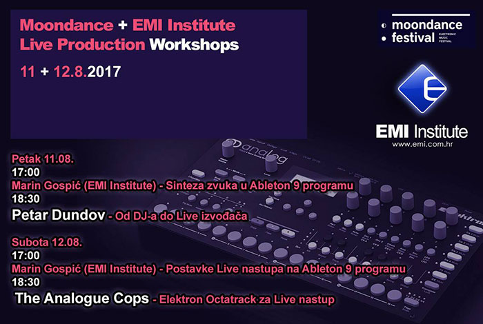 Moondance festival u saradnji s EMI Institute organizuje radionicu produkcije elektronske muzike u trogirskoj Gradskoj skupštini u petak 11. i subotu 12. avgusta od 17.00 časova. Predavači su Lucretio iz The Analogue Copsa, Petar Dundov i Marin Gospić. Teme su: sinteza zvuka u Abletone 9 programu, od DJ-a do Live izvođača, postavke Live nastupa na Abletone 9 programu, Electron Octatrack za Live nastup.