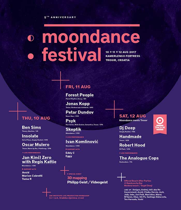 Osim već najavljenih headlinera na Moondance ponovo dolaze Marion Cobretti iz Berlina te The Analogue Cops, italijanski dvojac s adresom u berlinskom Tresoru, izvođači koji su opravdali da budu deo stalne postave Moondance-a.