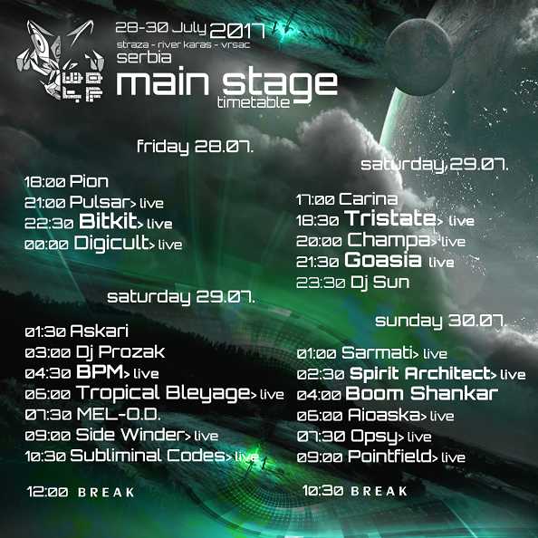 Na W.O.L.F-u će nastupiti veliki svetski psytrance izvođači DigiCult, Goasia, Boom Shankar, Bitkit, Tropical Bleyage, Pulsar, ali mnogo drugih globalno poznatih izvođača kao što su Spirit Architect, Carina, Aioaska, BPM, Sarmati, Champa, Tristate, Opsy, a program vam prenosimo u celosti