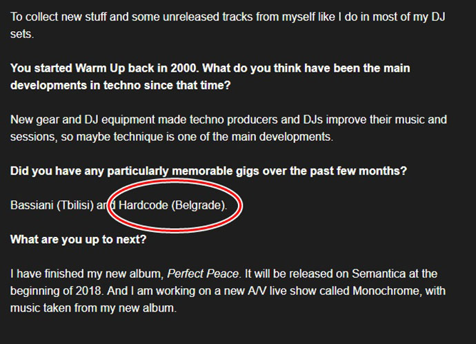 Novinar RA je vlasnika labela Pole Group i Warm Up, koji godinama diktaraju tempo na Starom kontinetu, u intervjuu pitao da li je imao neke nezaboravne “svirke” zadnjih meseci. Nakon čega je “kralj tame” kao najbolje trenutke izdvojio Hard Code žurku u Beogradu i gig u klubu Bassiani u Tbilisiju.