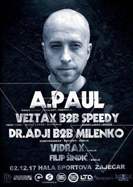 Za uvodni set, od 22h, biće zaduženi mladi Vidrax i Filip Šindrić, dok će prvi b2b pripasti organizatorima, Dr. Adjiju iz beogradskog „Subbteraneusa“ i Milenku iz niškog „Encoder Radija“, posle kojih će nastupiti jedan od osnivača techno scene u Portugaliji, legendarni A.Paul.