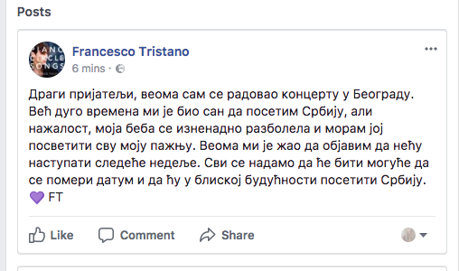 Francesco Tristano, danas je ovu informaciju podelio sa svojim fanovima, a mi izjavu prenosimo u celosti.