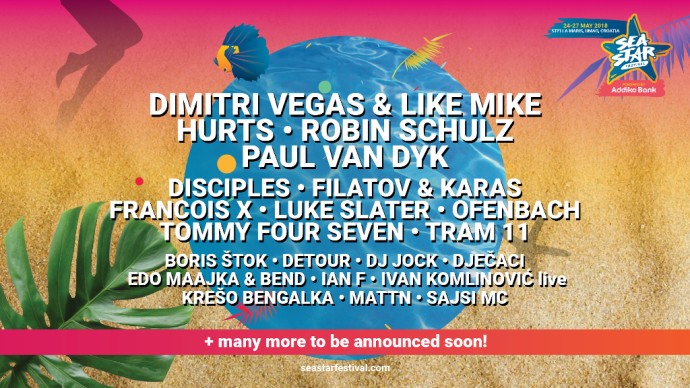 Drugo izdanje Sea Star Festivala od 24. do 27. maja osim jakog techno line-upa predstavlja i neke od najvećih svetskih i regionalnih muzičkih zvezda. Impresivan program čine svetski elektronski carevi Paul van Dyk, Robin Schulz i najveći svetski DJ duo Dimitri Vegas & Like Mike. Stadionski synth pop duo Hurts dodatno je žestoko pojačanje koje će zatresti binu u umaškom Stella Marisu, a uz njih će najluđu žurku održavati francuski electro rock duo Ofenbach, najfiniji londonski house Disciples, tvorci radijskih hitova Filatov & Karas, te energična MATTN. Uz strane zvezde na Sea Staru zasjaće i regionalni prvaci – Tram 11, Edo Maajka, Sajsi MC, Krešo Bengalka, Dječaci, Detour i Boris Štok.