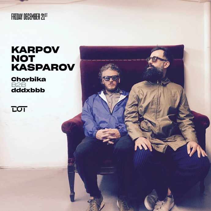 Eksperimentalni rumunski dvojac Karpov not Kasparov nastupiće u petak 21. decembra u klubu DOT, uz domaću podršku Chorbika b2b dddxbbb.