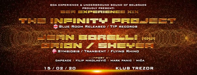 19. po redu GOA EXPERIENCE donosi pravo uzbuđenje. Po prvi put u Srbiji imaćemo prilike da čujemo legendarni Britanski projekat The Infinity Project, a uz njega na line up-u nastupaće i Jean Borelli (Orion / Sheyba) iz Danske, čije gostovanje čekamo jako dugo.