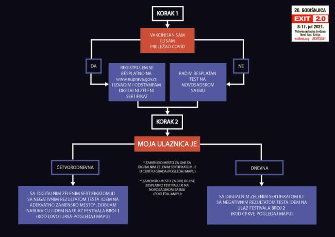 EXIT je na svom sajtu objavio zvanične procedure za ulazak posetilaca na ovogodišnje izdanje festivala. Ulaz na Tvrđavu od 8. do 11. jula biće ograničen na one koji ili poseduju Digitalni zeleni sertifikat, što znači da su vakcinisani ili preležali Kovid-19, ili na one koji imaju negativan brzi antigenski ili PCR test. EXIT je za kupce ulaznica obezbedio besplatne brze testove u Novom Sadu, dok će oni koji ulaze s pozivnicama te testove moći da urade u ovlašćenim laboratorijima Aqualaba, u više od 20 gradova u Srbiji, po specijalnoj ceni od svega 900 dinara. Proces zamene vaučera za festivalske narukvice biće vremenski značajno duži i podrazumevaće više provera u odnosu na ranije godine. Zbog toga, EXIT apeluje na sve posetioce da zamenu obave od ponedeljka 5. jula do srede 7. jula. Svima koji vaučere ne zamene do četvrtka, 8. jula do 20 časova, festival ne garantuje da će moći da uđu tokom prve večeri, usled stvaranja ogromnih gužvi.