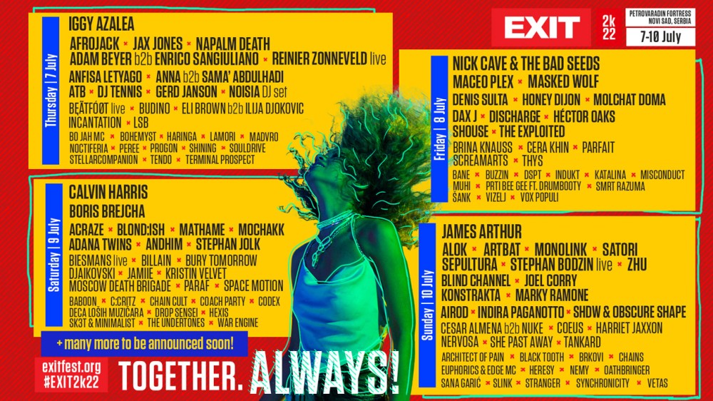 EXIT festival će biti održan na Petrovaradinskoj tvrđavi od 7. do 10. jula, uz potvrđena velika muzička imena kao što su Calvin Harris, Nick Cave & The Bad Seeds, Iggy Azalea, Afrojack, James Arthur, Masked Wolf, Joel Corry, Jax Jones, Alok, ATB, Sepultura, Napalm Death, Marky Ramone, Boris Brejcha, Honey Dijon, ARTBAT, Adam Beyer, Stephan Bodzin live, Enrico Sanguliano, Maceo Plex, Blond:ish, DJ Tennis, Reinier Zonneveld, Monolink, Denis Sulta, Anfisa Letyago, Mathame, Dax J, Adana Twins, ZHU, ACRAZE, Sama’ Abdulhadi, ANNA, Eli Brown, Molchat Doma, She Past Away, Konstrakta, Brkovi, Paraf, Noisia, Coach Party, Deca loših muzičara, Sana Garić, Vizelj, Prti Bee Gee i mnogi drugi!