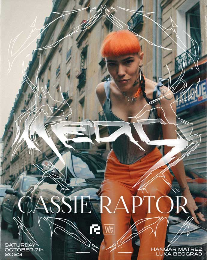 Cassie Raptor, umetnica iz Pariza, donosi mračne i energične techno setove, stvarajući atmosferu visokog intenziteta.