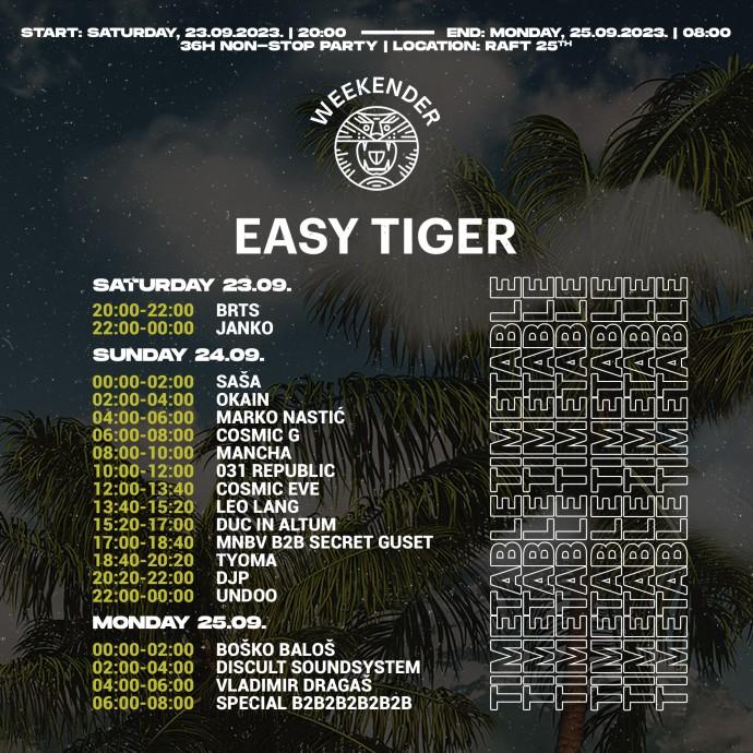 Easy Tiger i Raft 25th su za kraj leta spremili posebnu poslasticu i unikatni koncept EASY TIGER WEEKENDER! Ove subote, 23. septembra sa početkom u 20h, preko 18 DJ-eva, će neprekidno puštati muziku punih 36 sati, sve do ponedeljka 25.09. u 08h!
