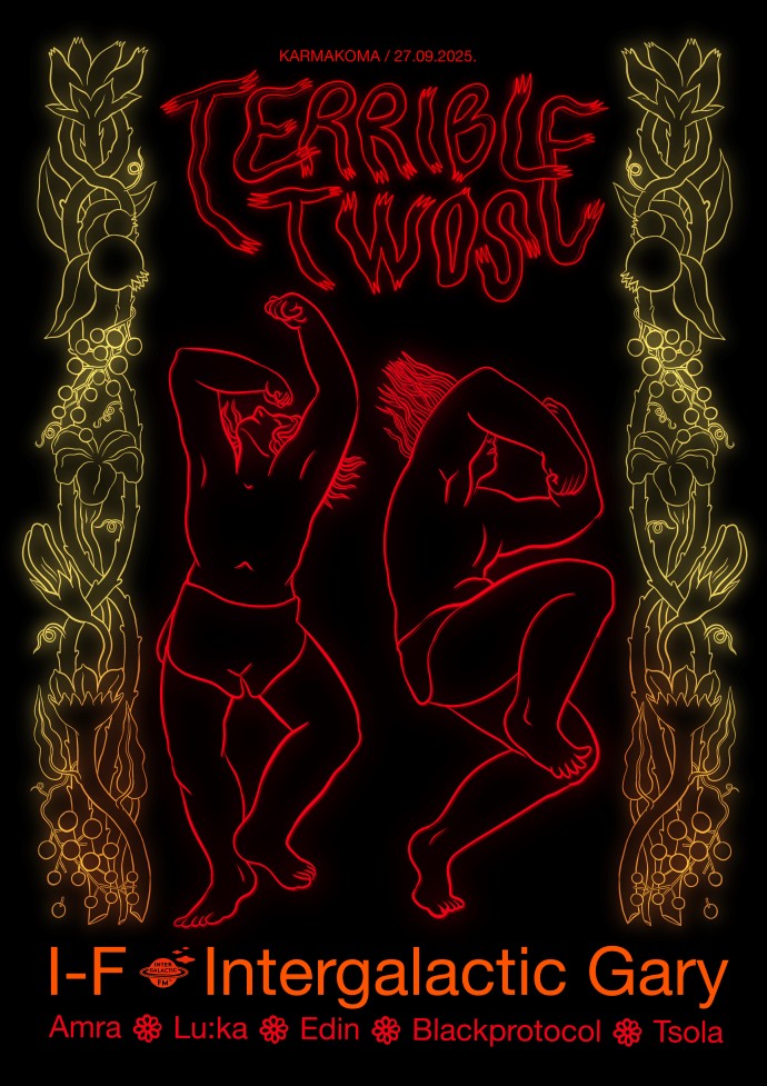 Iz Haga nam stižu osnivač radija i legenda Italo i Acid zvuka, I-F, kao i jedan od omiljenih predstavnika zapadne obale Holandije, Intergalactic Gary. Njima će podršku pružiti niz di-džejeva koji se sada već redovno smenjuju na Terrible Twos žurkama. Klub vrata otvara u 21:00, a karte za žurku možete da kupite na sajtovima Gigstix i Resident Advisor po ceni od 17 EUR.