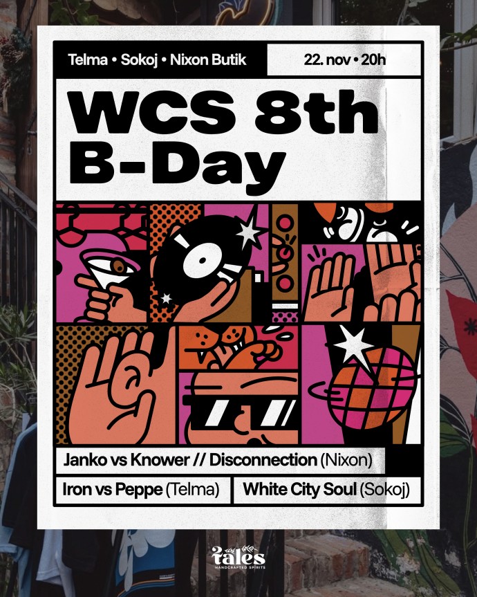 Ovog meseca, tačnije 22. novembra sa početkom od 20h, White City Soul ekipa slavi 8 godina postojanja na 3 bine sa 7 DJ-eva i specijalnim gostima. Ceo događaj je smešten u Mišarsku ulicu, a lokacije na kojima će biti žurke su Nixon butik, Telma restoran i Sokoj klub. Sva tri prostora su veoma blizu, pa ćete uz kupljenu kartu dobiti narukvicu sa kojom ćete moći da idete iz kluba u klub. Jedinstvena cena karte u pretprodaji je 1.000 dinara i možete ih kupiti u Telmi i Nixonu.